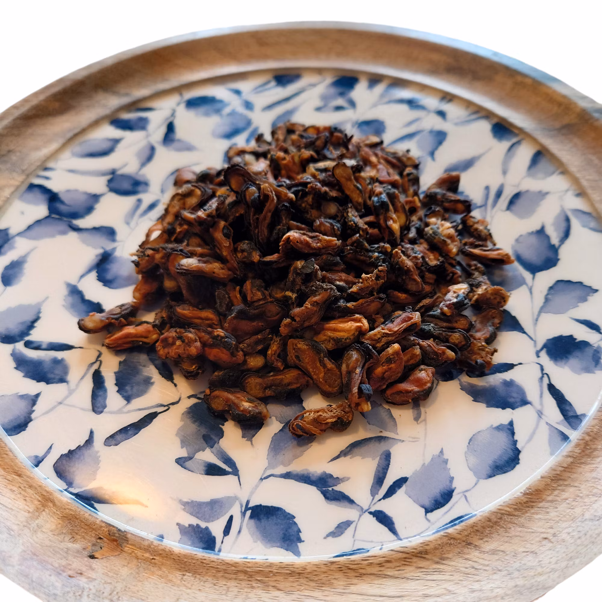 Dessa torkade skalade blåmusslor är perfekta mumsbitar! På bilden är det 70 gram musslor på ett uppläggningsfat.